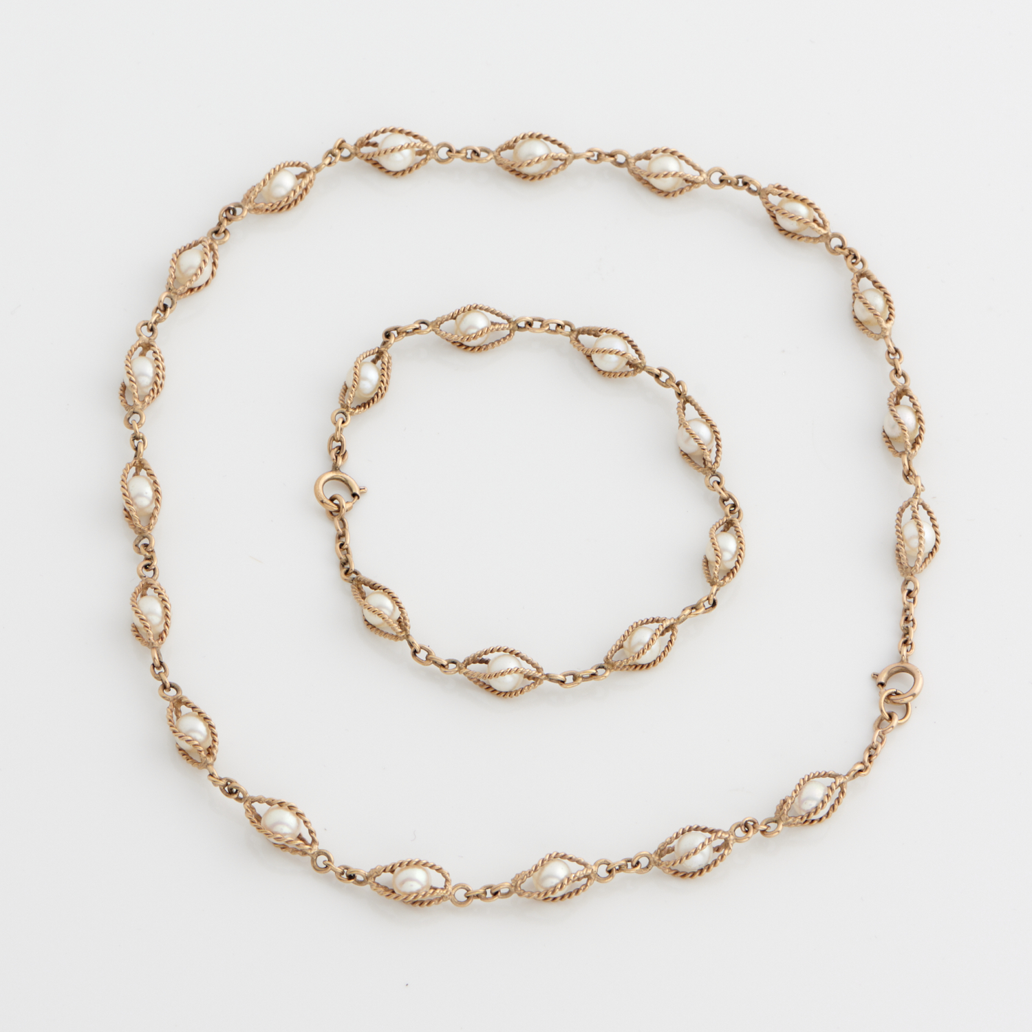 A PEARL SUITE IN 9CT GOLD, COMPRISING A BRACELET AND NECKLACE, 23.4GMS