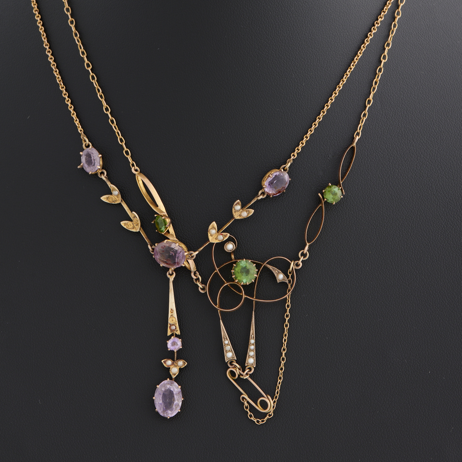 TWO EDWARDIAN GEM-SET AND SEED PEARL NECKLACES IN 9CT GOLD, 420MM AND 410MM, 11.6GMS