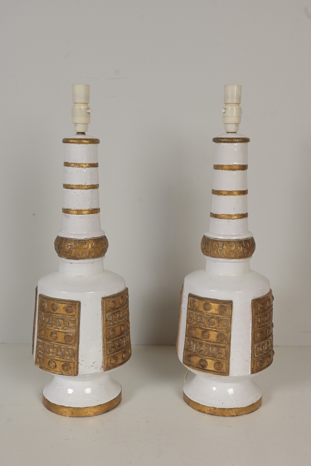 A PAIR OF ITALIAN GLAZED TERRACOTTA AND GILT TABLE LAMPS (66H CM) (LEONARD JOEL DELIVERY: LARGE)