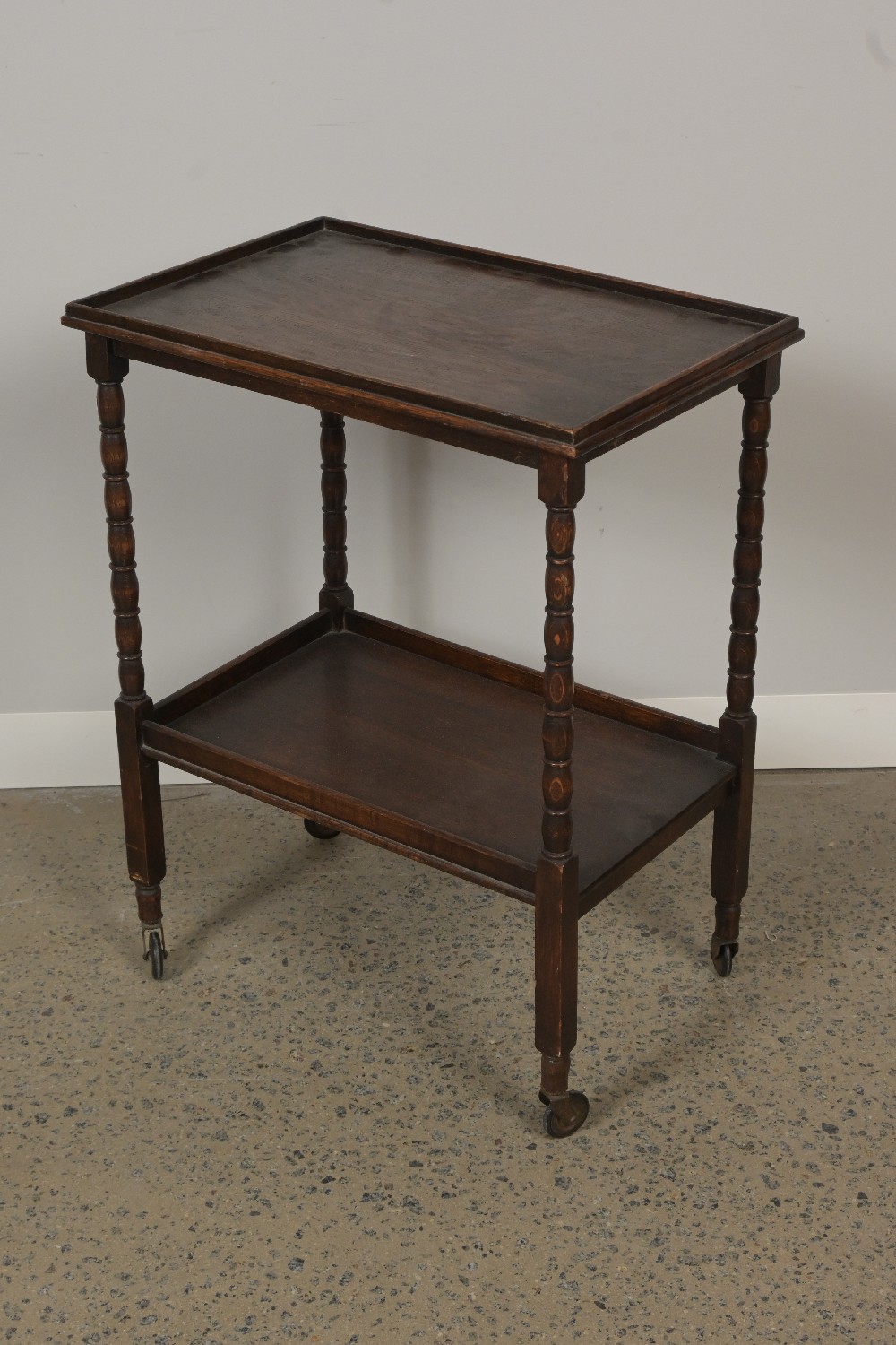 A TWO TIER AUTO TROLLEY ON TURNED SUPPORTS (A/F) (72H X 39W X 56D CM) (LEONARD JOEL DELIVERY: LARGE)
