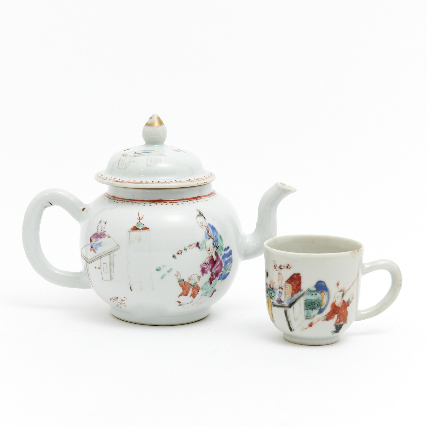 A PORCELAIN CHINOISSERIE TEA POT AND MATCHED TEA CUP (A/F) L.19CM, LEONARD JOEL DELIVERY SIZE: SMALL