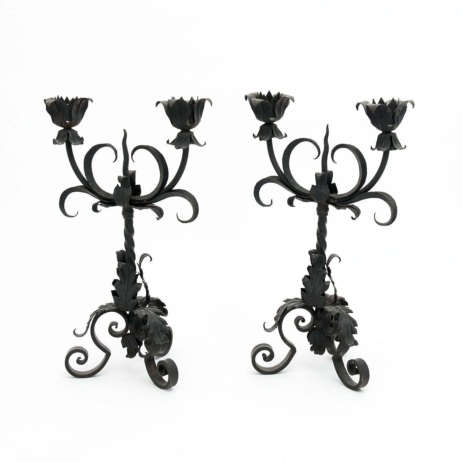 A PAIR OF WROUGHT IRON CANDLE STICKS H.38CM, LEONARD JOEL DELIVERY SIZE: MEDIUM