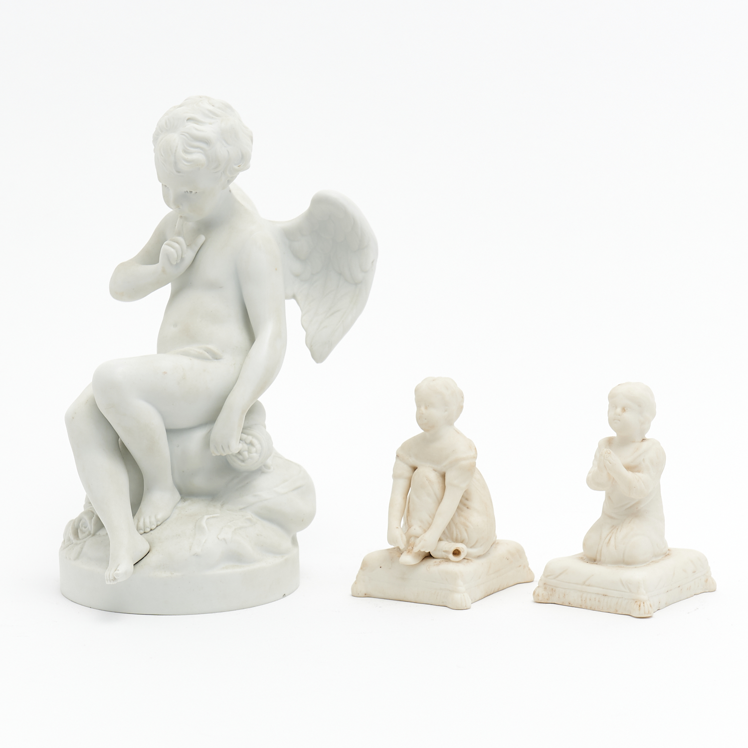 THREE BISQUE PORCELAIN FIGURES INCLUDING A SEATED ANGEL AND A PAIR OF KNEELING CHILDREN H.20CM (TALLEST), LEONARD JOEL DELIVERY SIZE: SMALL