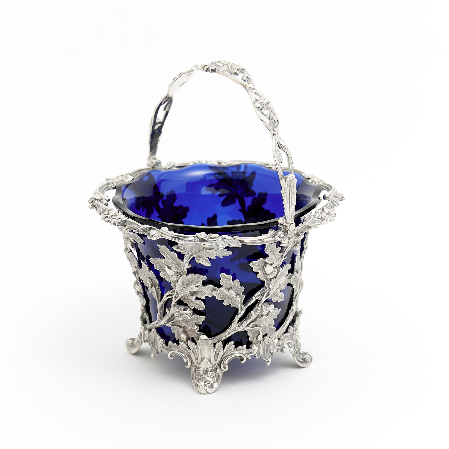 A VICTORIAN STERLING SILVER BASKET WITH BLUE GLASS LINER 226G (EXCLUDING LINER) H.9.5CM, LEONARD JOEL DELIVERY SIZE: SMALL