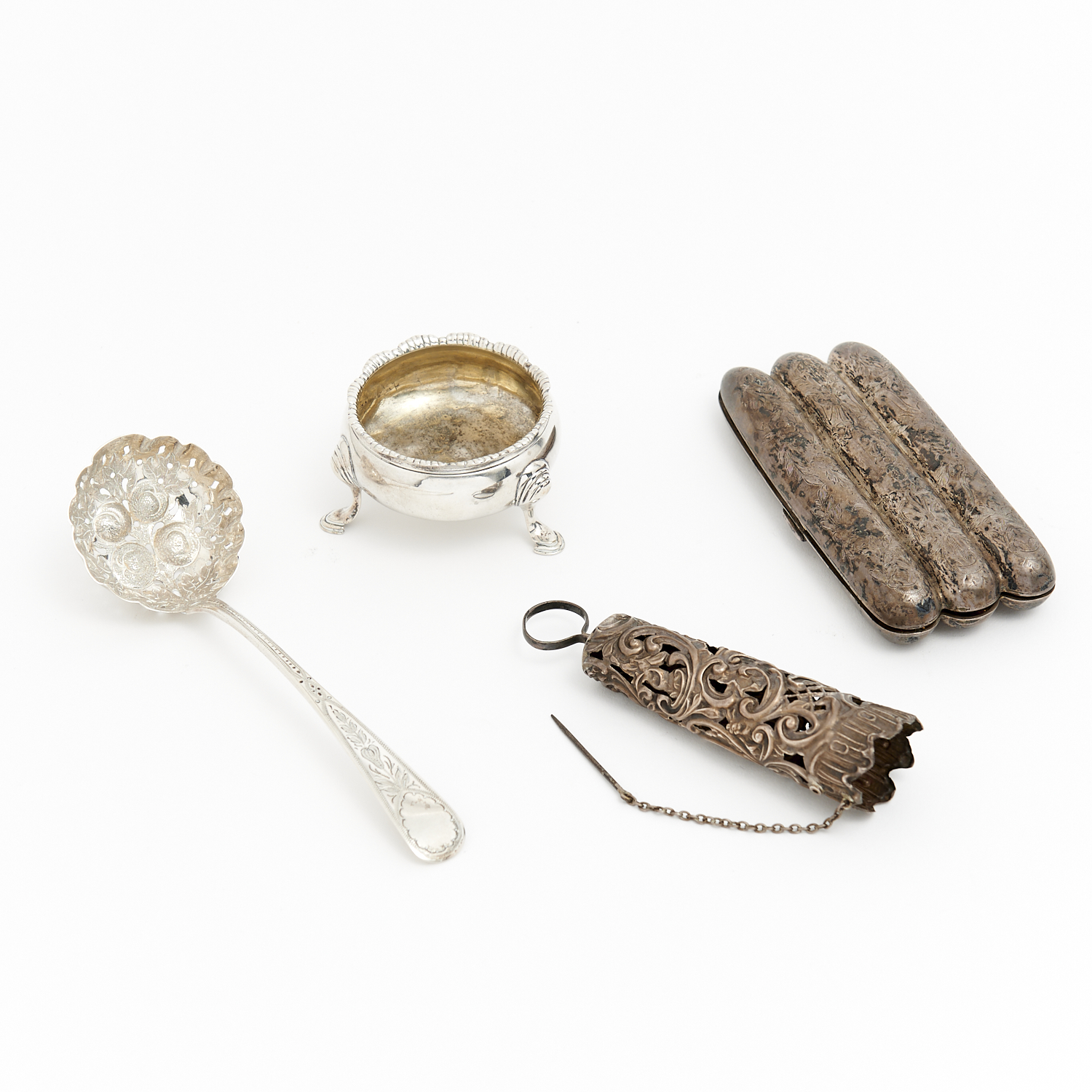 A COLLECTION OF STERLING SILVER INCLUDING A GEORGIAN SIFTING SPOON, A CIGAR CASE AND A SALT 172G L.16.5CM (LARGEST), LEONARD JOEL DELIVERY SIZE: SMALL