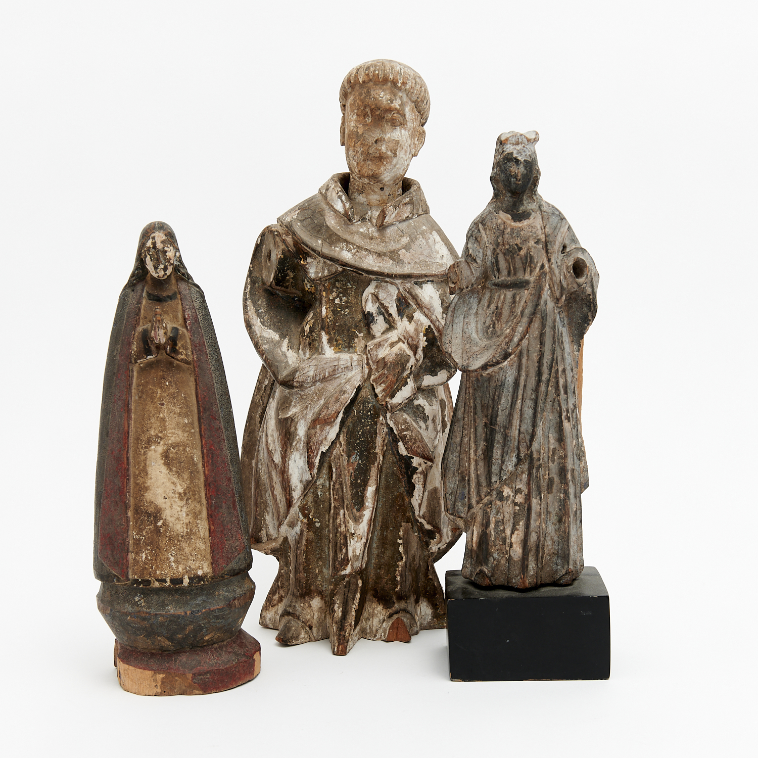 THREE SANTOS FIGURES INCLUDING ONE POLY CHROMED PRAYING FIGURE H.35CM (A/F), LEONARD JOEL DELIVERY SIZE: MEDIUM