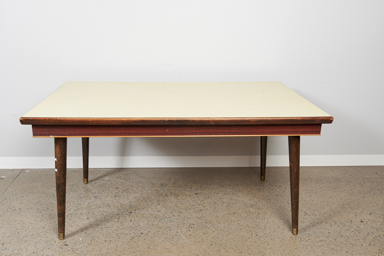 A MID-CENTURY DINING TABLE WITH LAMINEX TOP (A/F) (76H X 153W X 93D CM) (THIS HEAVY ITEM MUST BE REMOVED BY CARRIERS AT THE CUSTOMER'S EXPENSE. LEONARD JOEL STAFF CANNOT ASSIST CARRYING THIS ITEM) (X-LARGE)
