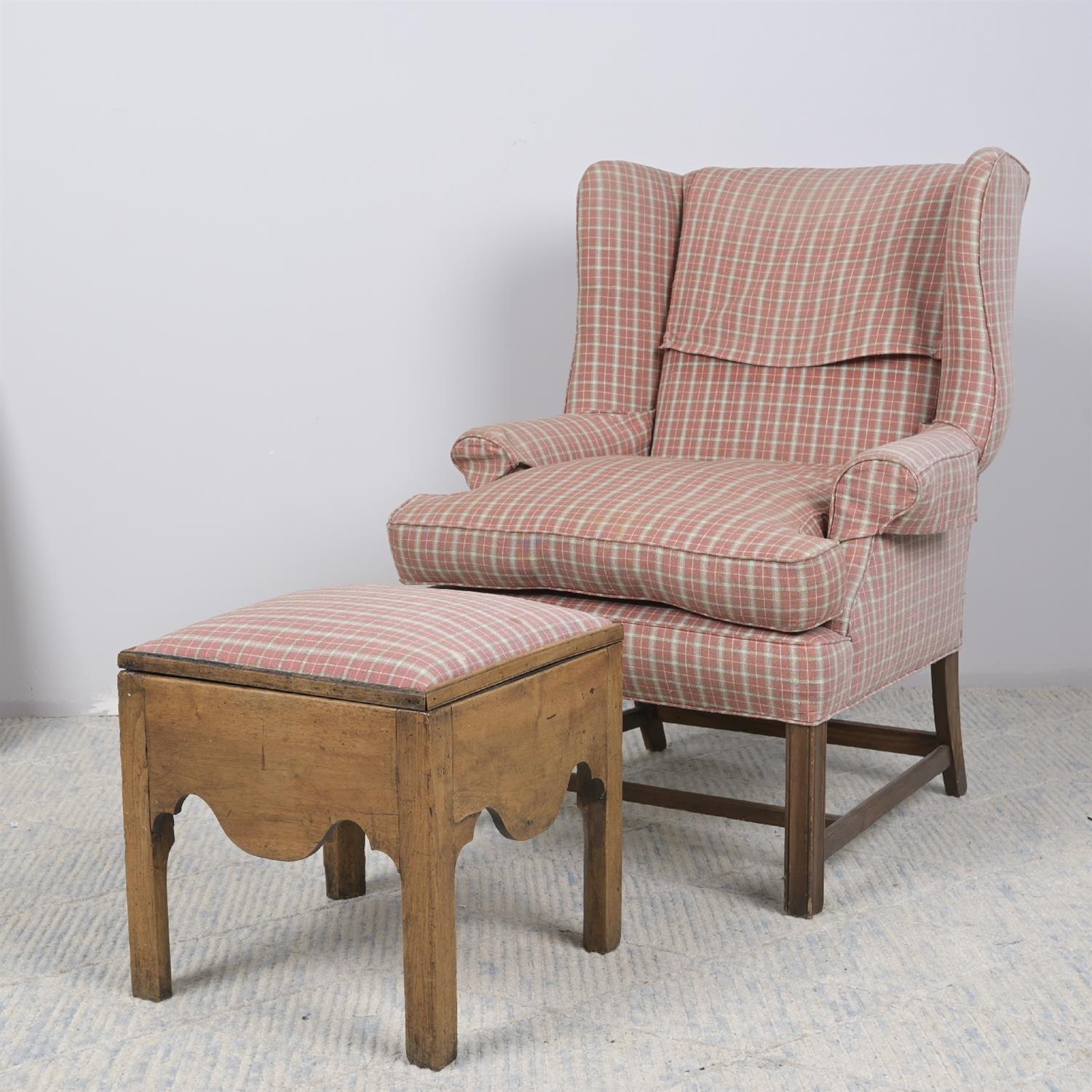 A GEORGE III-STYLE MAHOGANY AND UPHOLSTERED WING ARMCHAIR, TOGETHER WITH AN ALTERED GEORGE III PERIOD STOOL IN MATCHING FABRIC (104H X 82W X 72D CM) (LEONARD JOEL DELIVERY: X-LARGE) Provenance: Private Collection, Toorak