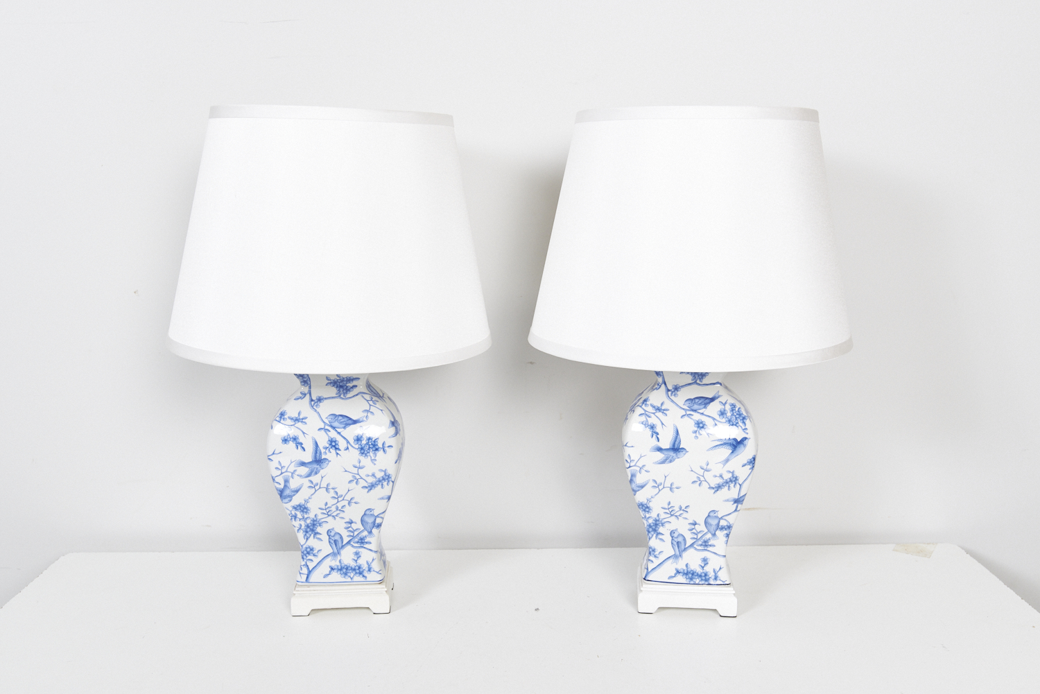 A PAIR OF BLUE AND WHITE CERAMIC TABLE LAMPS (58H X 36DIA CM) (LEONARD JOEL DELIVERY: MEDIUM)