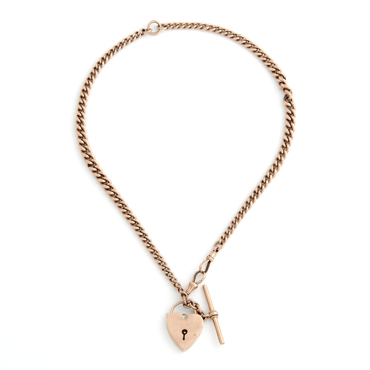 A FOB CHAIN TO A T BAR AND HEART PADLOCK CHARM IN 9CT GOLD, 460MM, 58.4GMS