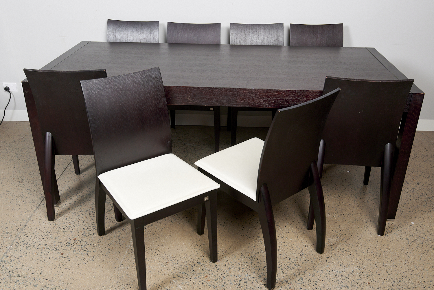 A CONTEMPORARY NINE PIECE DINING SETTING (77H X 200W X 90D CM) (THIS HEAVY ITEM MUST BE REMOVED BY CARRIERS AT THE CUSTOMER'S EXPENSE. LEONARD JOEL STAFF CANNOT ASSIST CARRYING THIS ITEM) (X-LARGE)