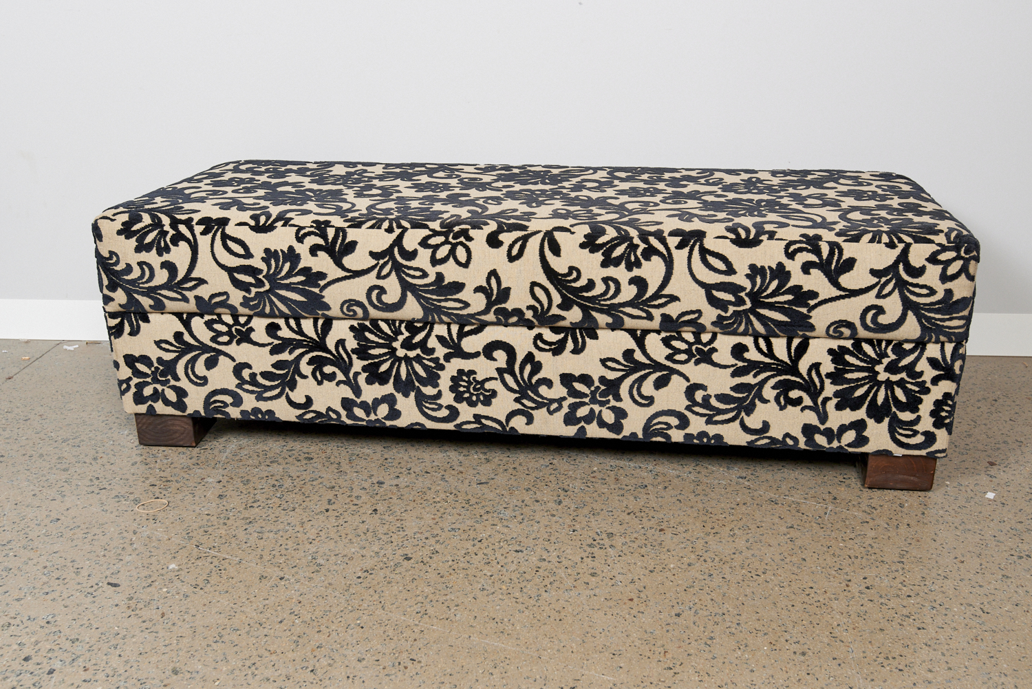 A LARGE FLORAL UPHOLSTERED OTTOMAN IN NAVY & CREAM TONES (43H X 146W X 60D CM) (LEONARD JOEL DELIVERY: X-LARGE)