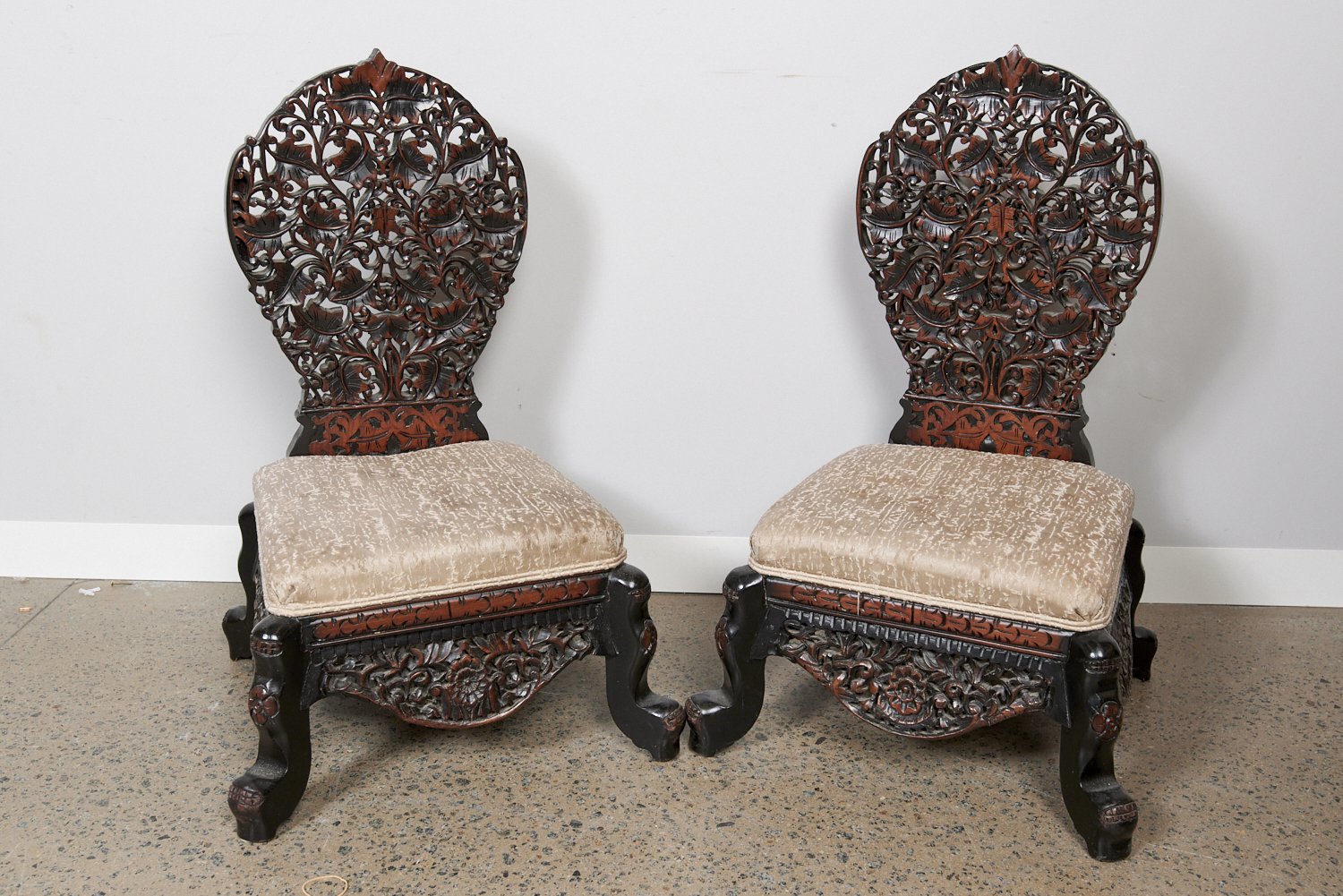 TWO ANGLO INDIAN ORNATELY CARVED SALON CHAIRS (A/F) (89H X 56W X 53D CM) (LEONARD JOEL DELIVERY: LARGE)