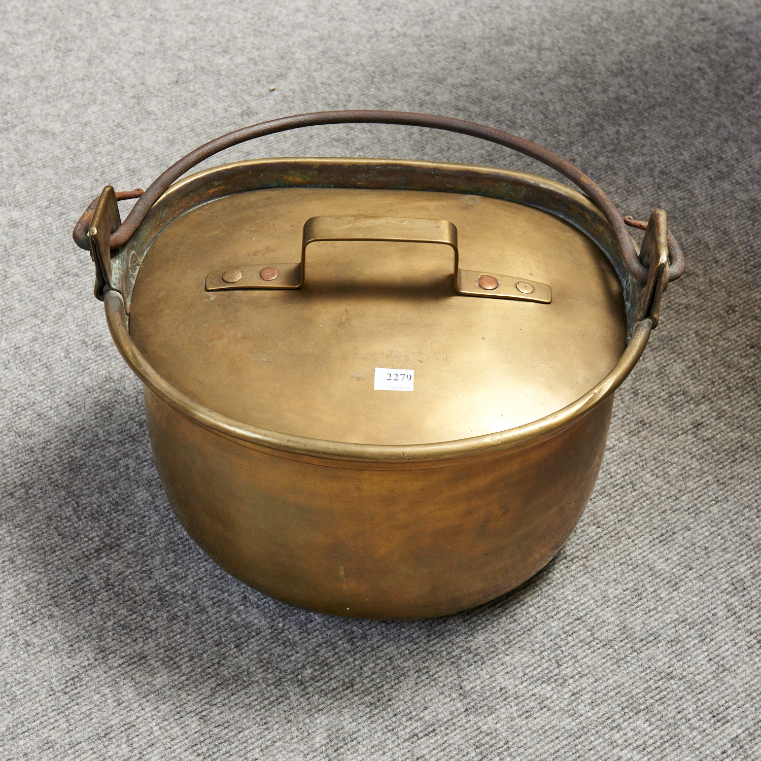 A FRENCH COPPER AND CAST IRON SWING HANDLED COOKING/PRESERVING PAN W.38CM, LEONARD JOEL DELIVERY SIZE: LARGE