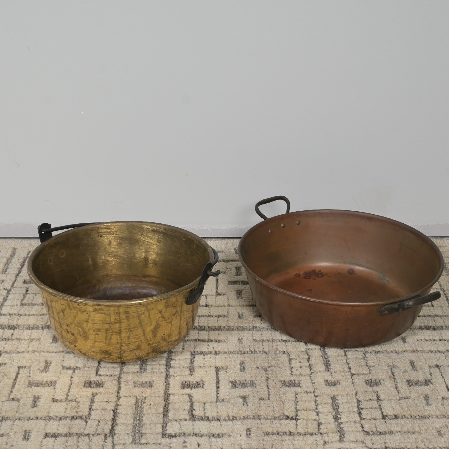 TWO FRENCH BRASS HANDLED PRESERVING POTS (15H X 48W CM) (LEONARD JOEL DELIVERY: LARGE)