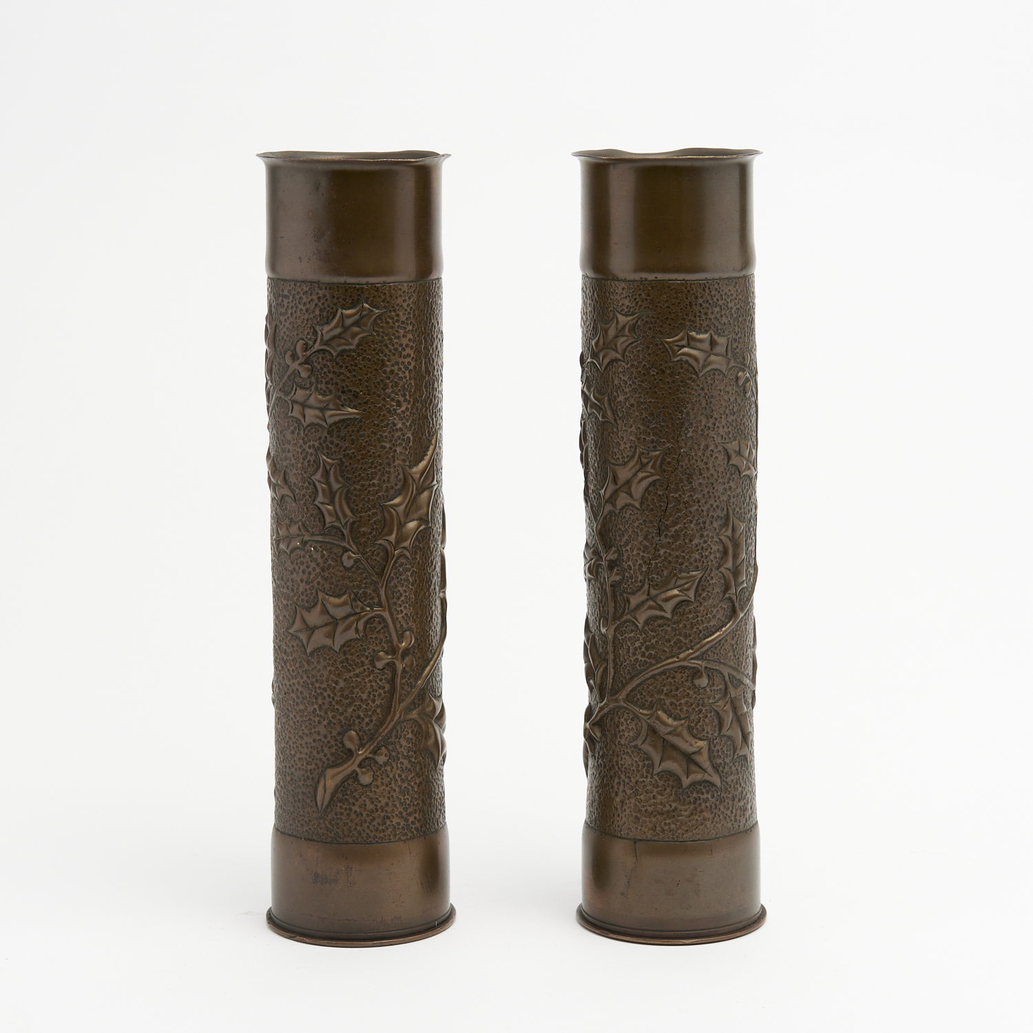 A PAIR OF TRENCH ART EMBOSSED SHELLS WITH HOLLY DECORATION H.34.5CM, LEONARD JOEL DELIVERY SIZE: MEDIUM