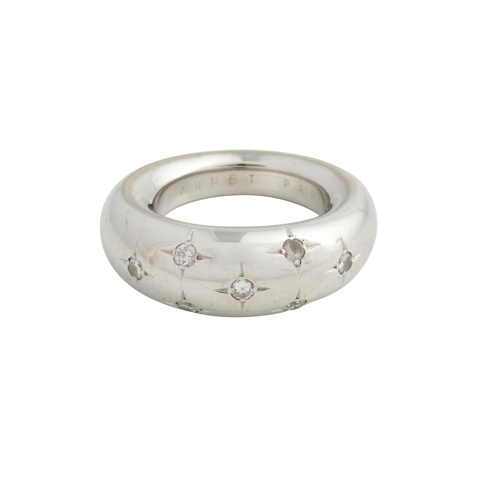 Of half bombé design, set to the front with brilliant-cut diamonds, the diamonds together weighing approximately 0.30 carats, mounted in 18ct white gold, size M1/2, gross weight approximately 11.5 grams, numbered 3xxxx8, French assay marks, signed Chaumet Paris.
