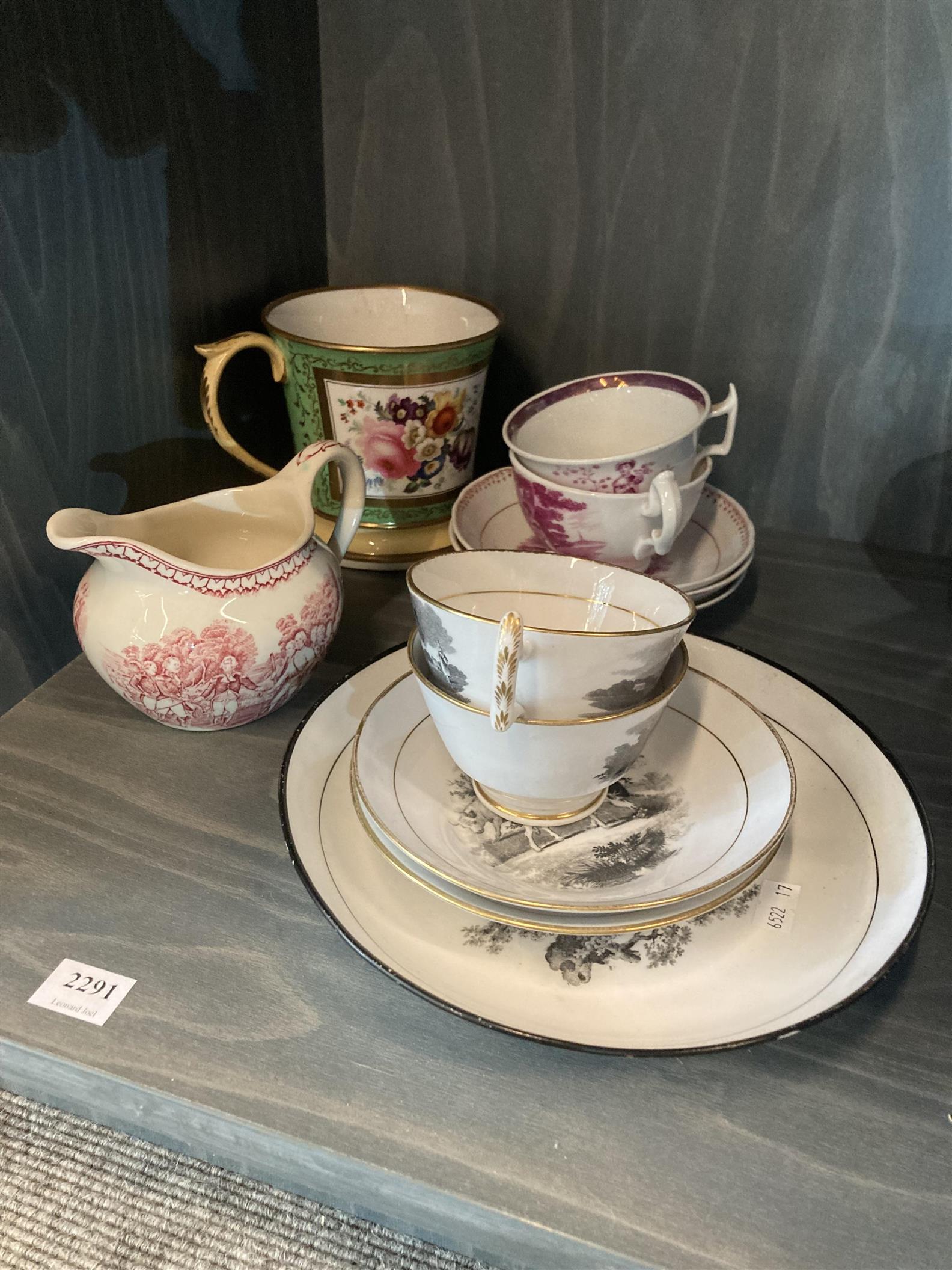 A GROUP OF ASSORTED PORCELAIN INCLUDING TRANSFERWARE CUPS AND SAUCERS, A JUG AND LARGE MUG DIA.21CM (LARGEST), LEONARD JOEL DELIVERY SIZE: MEDIUM