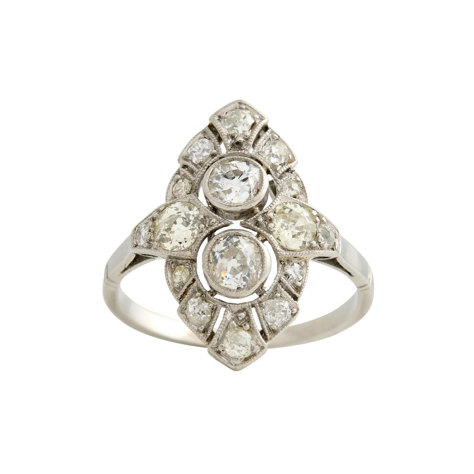 Of geometric design, centring two collet-set old European-cut diamonds, with in an openwork pierced plaque set with old-cut diamonds, the diamonds together weighing approximately 1.00 carats, mounted in platinum, size M1/2, gross weight approximately 4.1 grams