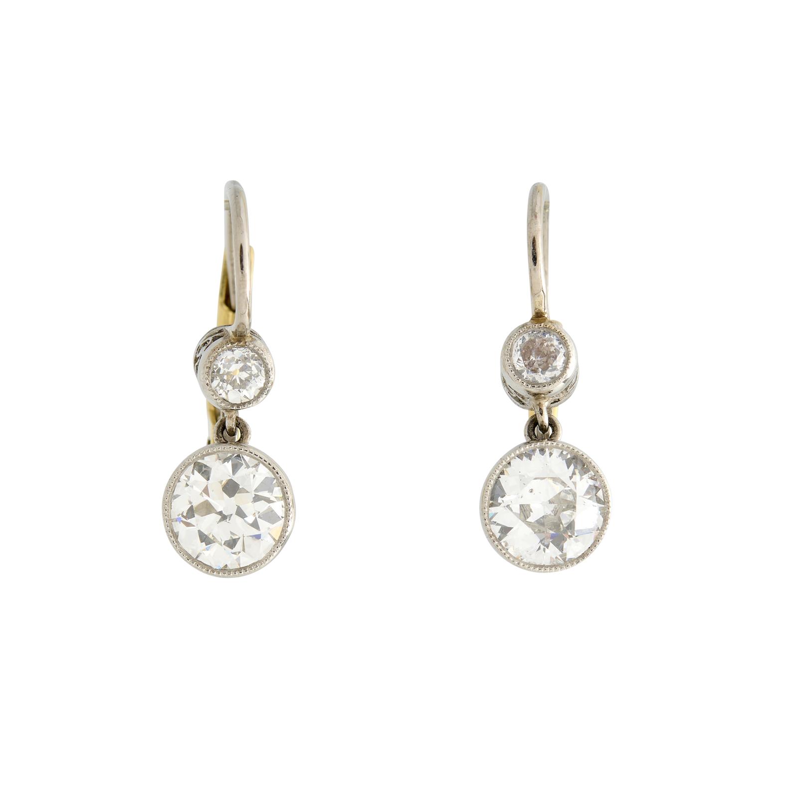 Each terminating in a collet-set swing drop centring an old-cut diamond together weighing approximately 1.37 carats, surmounted by a similarly set diamond, the small diamonds together weighing approximately 0.30 carats, mounted in platinum and gold, length 19.5mm, post and clip fittings, gross weight approximately 3.1 grams.
