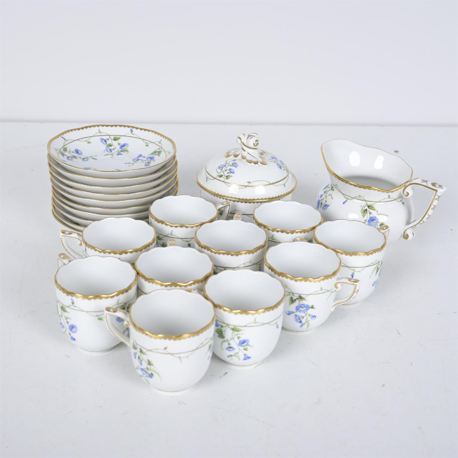 A HEREND PORCELAIN 'MORNING GLORY' PATTERN DEMI TASSE SET FOT TEN, WITH CREAMER AND LIDDED SUGAR POT. (10H CM) (LEONARD JOEL DELIVERY: SMALL) Provenance: Private Collection, Toorak
