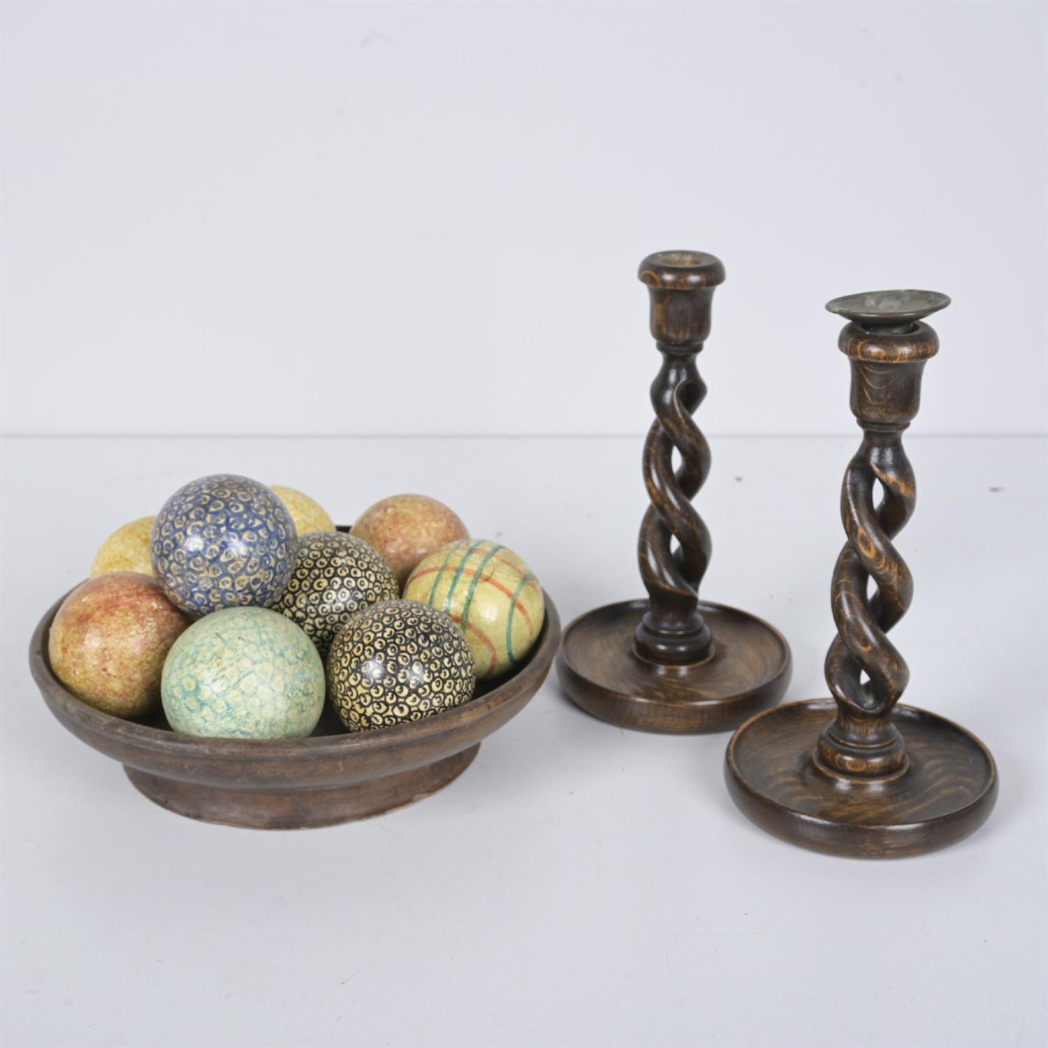 A RUSTIC WOODEN BOWL WITH PAINTED CARPET BOWLS, TOGETHER WITH A PAIR OF WOODEN BARLEY TWIST CANDLESTICKS. (30DIA CM) (LEONARD JOEL DELIVERY: MEDIUM) Provenance: Private Collection, Toorak