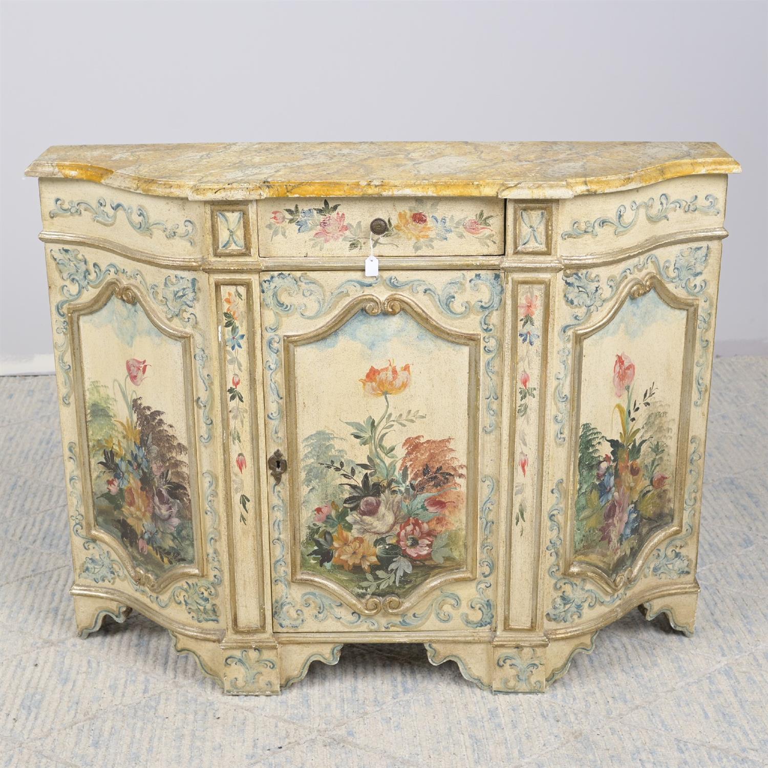 A DECORATIVELY PAINTED SIDE CABINET IN 18th CENTURY ITALIAN STYLE, THE TOP PAINTED TO SIMULATE MARBLE. (82H X 108W X 31D CM) (LEONARD JOEL DELIVERY: LARGE) Provenance: Private Collection, Toorak