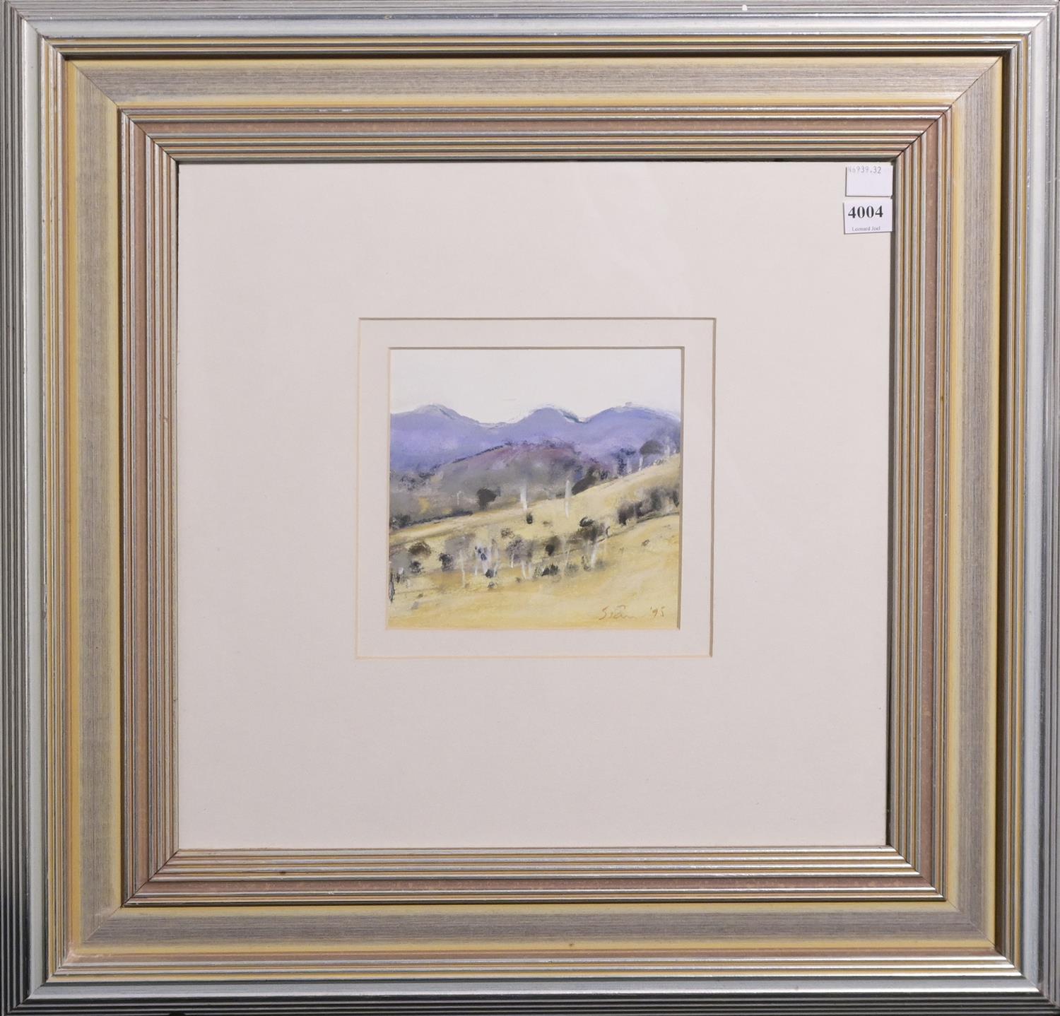 SIAN DODD, (LANDSCAPE) 1995, GOUACHE AND PASTEL ON PAPER, SIGNED AND DATED LOWER RIGHT, 15 X 15CM, FRAME SIZE: 55 X 55CM
