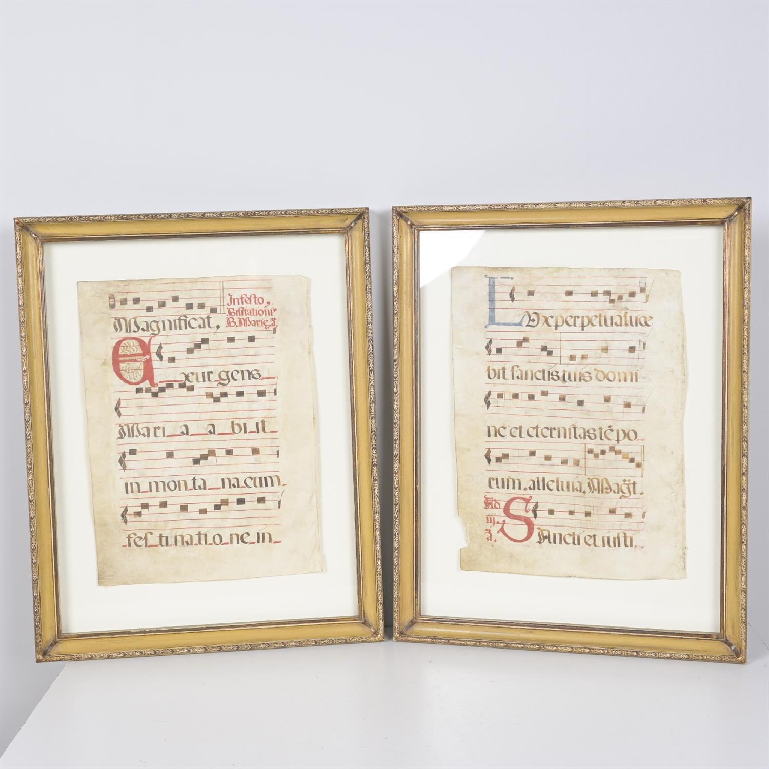 TWO FRAMED 18th CENTURY MANUSCRIPT FOLIOS OF ANTIPHONAL MUSIC. (77H X 61W CM) (LEONARD JOEL DELIVERY: LARGE). Provenance: Private Collection, Toorak