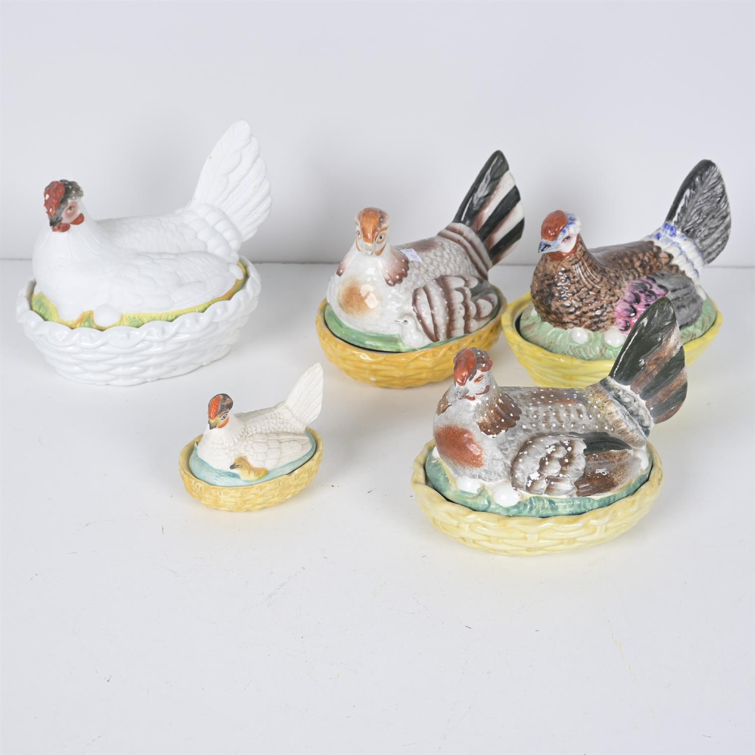 A GROUP OF FIVE CERAMIC HEN TUREENS, LATE 19TH CENTURY AND LATER. (19H X 23W X 20D CM) (LEONARD JOEL DELIVERY: SMALL) Provenance: Private Collection, Toorak