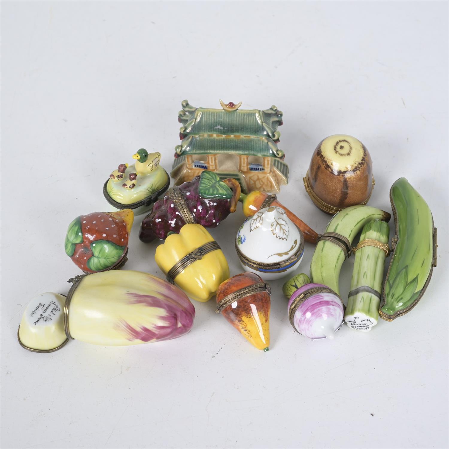 A GROUP OF THIRTEEN LIMOGES PORCELAIN FRUIT AND VEGETABLE FORM BOXES TOGETHER WITH A CHINESE PORCELAIN ORNAMENT. (7H CM) (LEONARD JOEL DELIVERY: SMALL). Provenance: Private Collection, Toorak