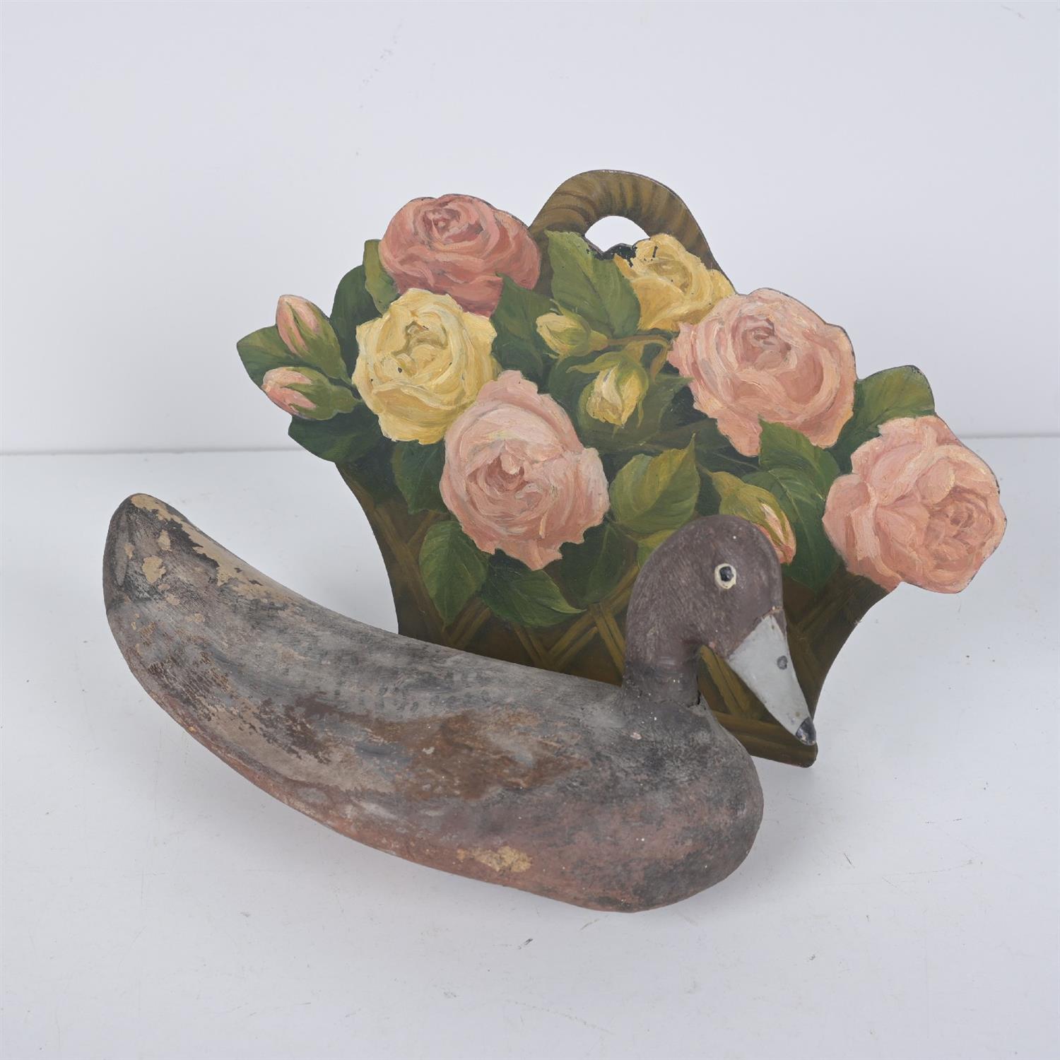 A CARVED WOODEN DECOY DUCK TOGETHER WITH A HANDPAINTED DOORSTOP. (17H X 20W X 34D CM) (LEONARD JOEL DELIVERY: MEDIUM) Provenance: Private Collection, Toorak