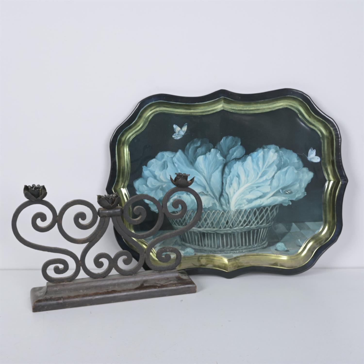 A WROUGHT IRON CANDELABRA TOGETHER WITH TOILE STYLE TRAY WITH CABBAGE AND INSECT MOTIFS. (44H X 56W CM) (LEONARD JOEL DELIVERY: MEDIUM) Provenance: Private Collection, Toorak