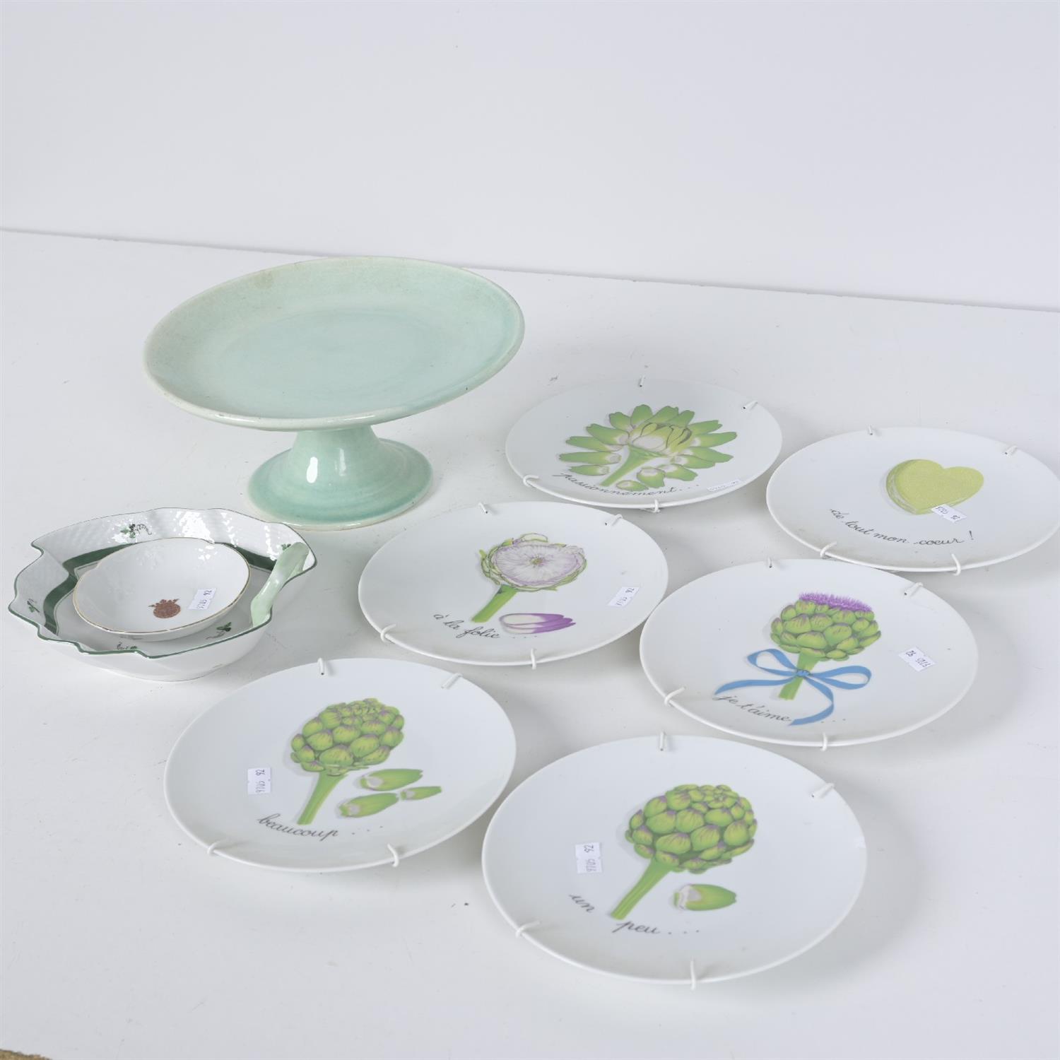 A SET OF SIX LIMOGES ARTICHOKE PLATES TOGETHER WITH A CAKE STAND AND TWO OTHER SMALL PORCELAIN DISHES. (12H X 25DIA CM) (LEONARD JOEL DELIVERY: MEDIUM) Provenance: Private Collection, Toorak