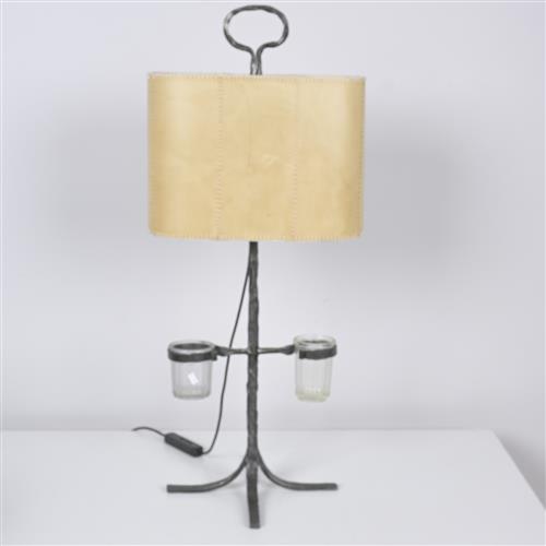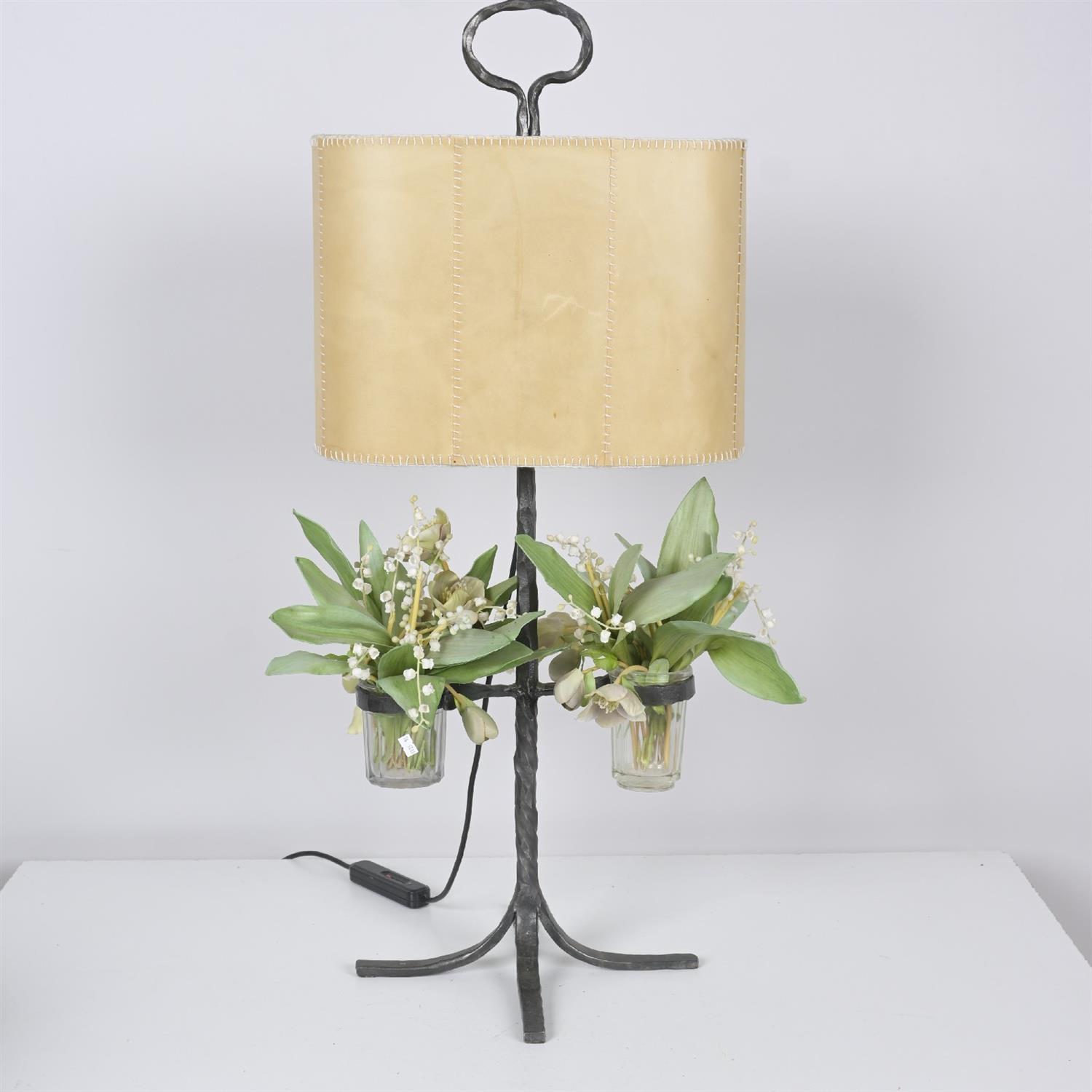A FRENCH WROUGHT IRON TABLE LAMP WITH GLASS JARS AND WAX FLOWERS. (99H X 42W X 37D CM) (LEONARD JOEL DELIVERY: LARGE) Provenance: Private Collection, Toorak