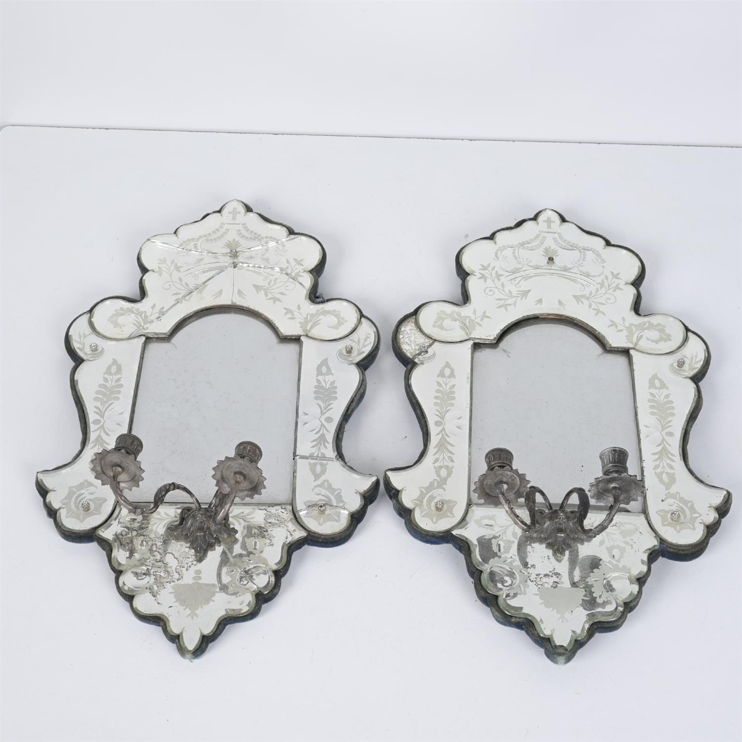 TWO VENETIAN MIRRORED GIRANDOLES (A/F). (64H X 37W CM) (LEONARD JOEL DELIVERY: LARGE) Provenance: Private Collection, Toorak