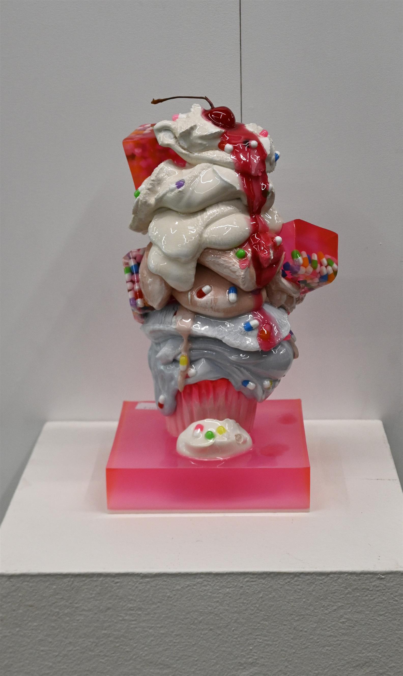 OLIVIA BONILLA, (CUPCAKE), PIGMENTED CEMENT, RESIN, ENAMEL AND ALUMINIUM ON ARTIST MADE BASE, SIGNED BELOW BASE, 31CM (HEIGHT)