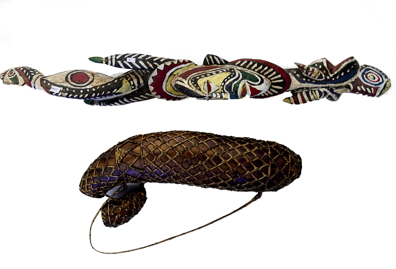 A PAPUA NEW GUINEA POLYCHROME CARVING AND A GOURD AND CANED VESSEL (A/F) L.104CM (LARGEST), LEONARD JOEL DELIVERY SIZE: LARGE