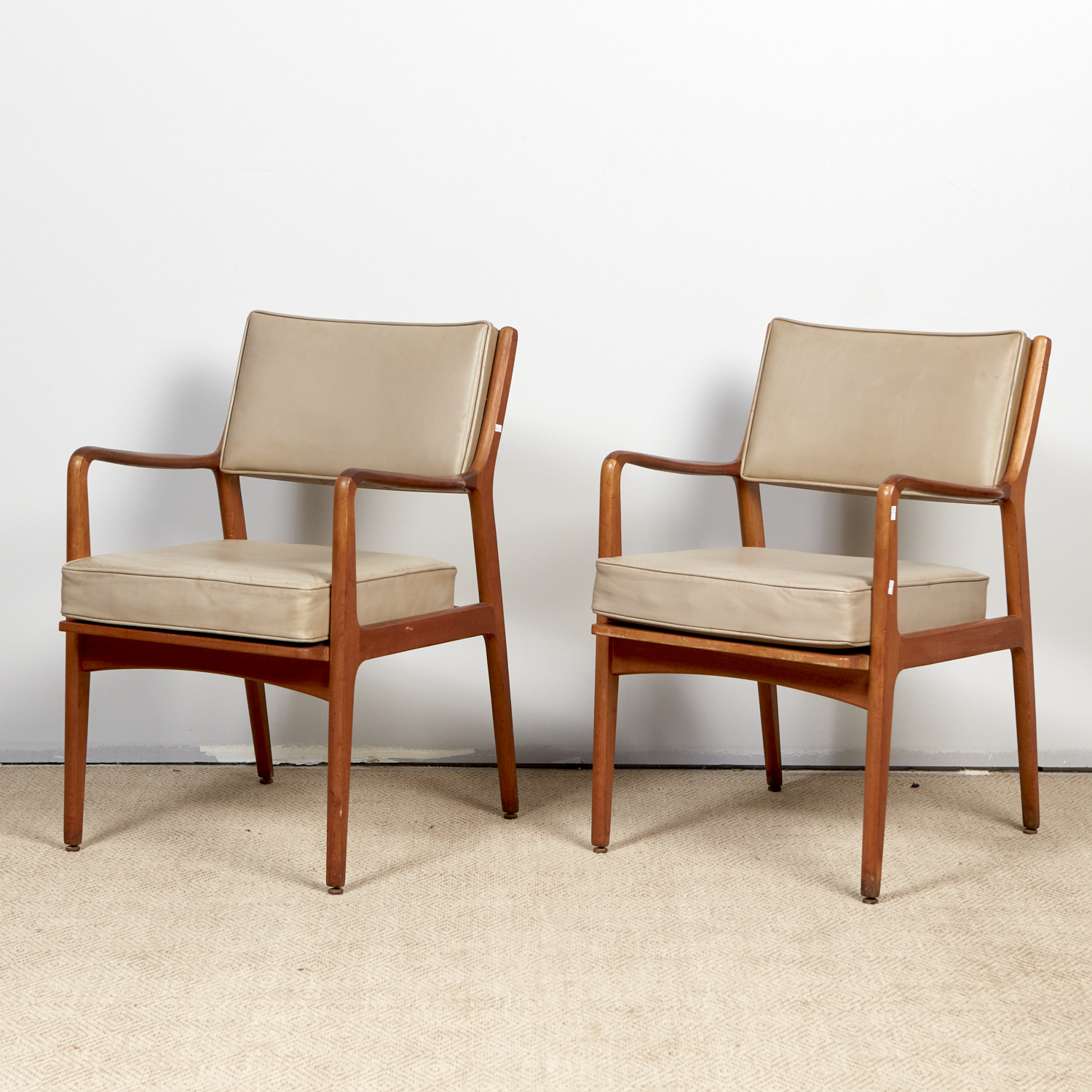 A PAIR OF MID-CENTURY AUSTRALIAN TEAK AND VINYL UPHOLSTERED ARMCHAIRS (89H X 65W X 60D CM) (LEONARD JOEL DELIVERY: LARGE)