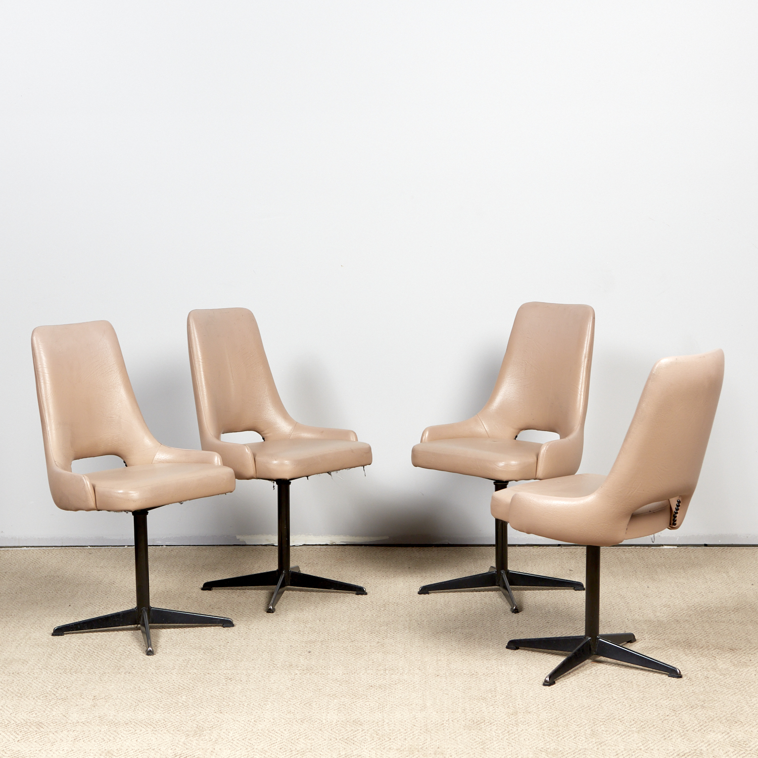 A SET OF FOUR AUSTRALIAN VINYL UPHOSTERED SWIVEL CHAIRS (A/F) (87H X 51W X 57D CM) (LEONARD JOEL DELIVERY: LARGE)