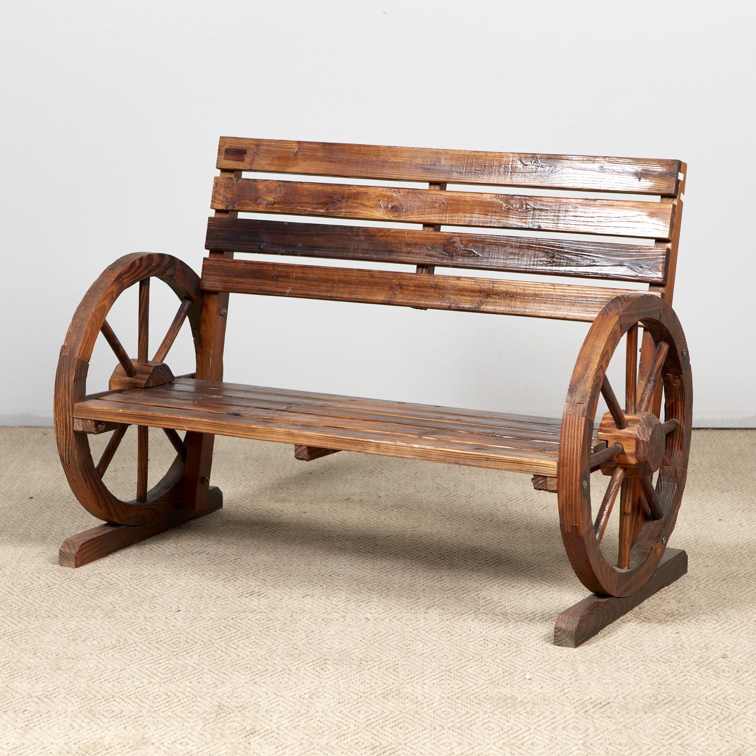A WAGON WHEEL ENDED OUTDOOR BENCH SEAT (76H X 109W X 56D CM) (LEONARD JOEL DELIVERY: X-LARGE)