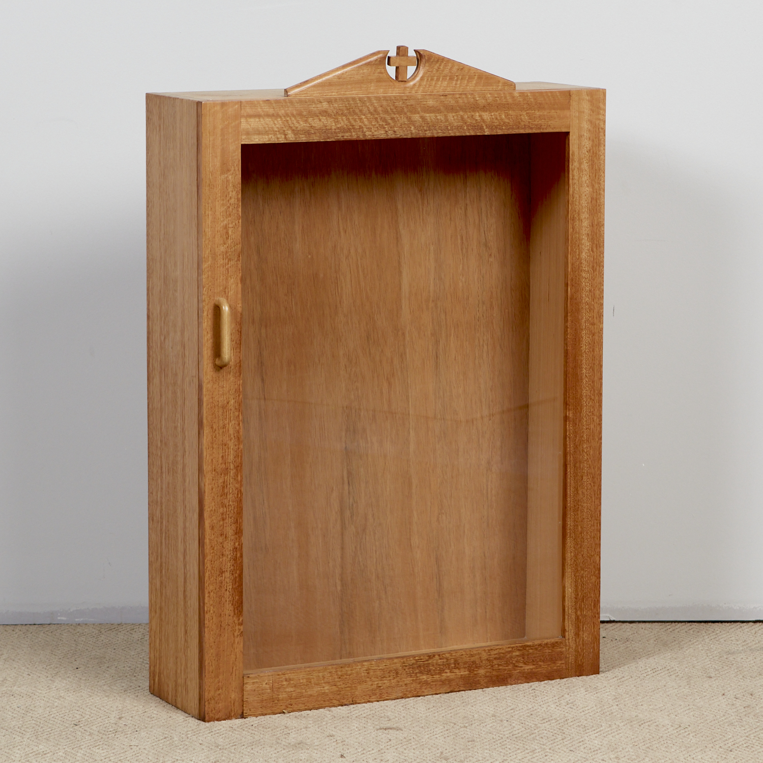 AN AUSTRALIAN ASH GLASS FRONTED DISPLAY CABINET WITH CRUCIFIX APEX (110H X 74W X 26D CM) (LEONARD JOEL DELIVERY: X-LARGE)