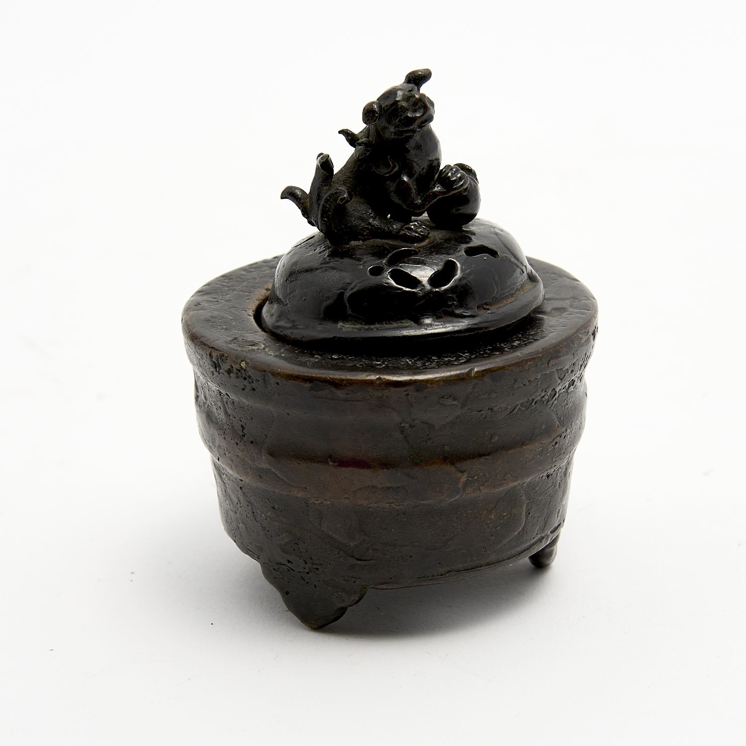 A CHINESE BRONZE INCENSE BURNER WITH SEAL TO BASE H.11CM, LEONARD JOEL DELIVERY SIZE: SMALL