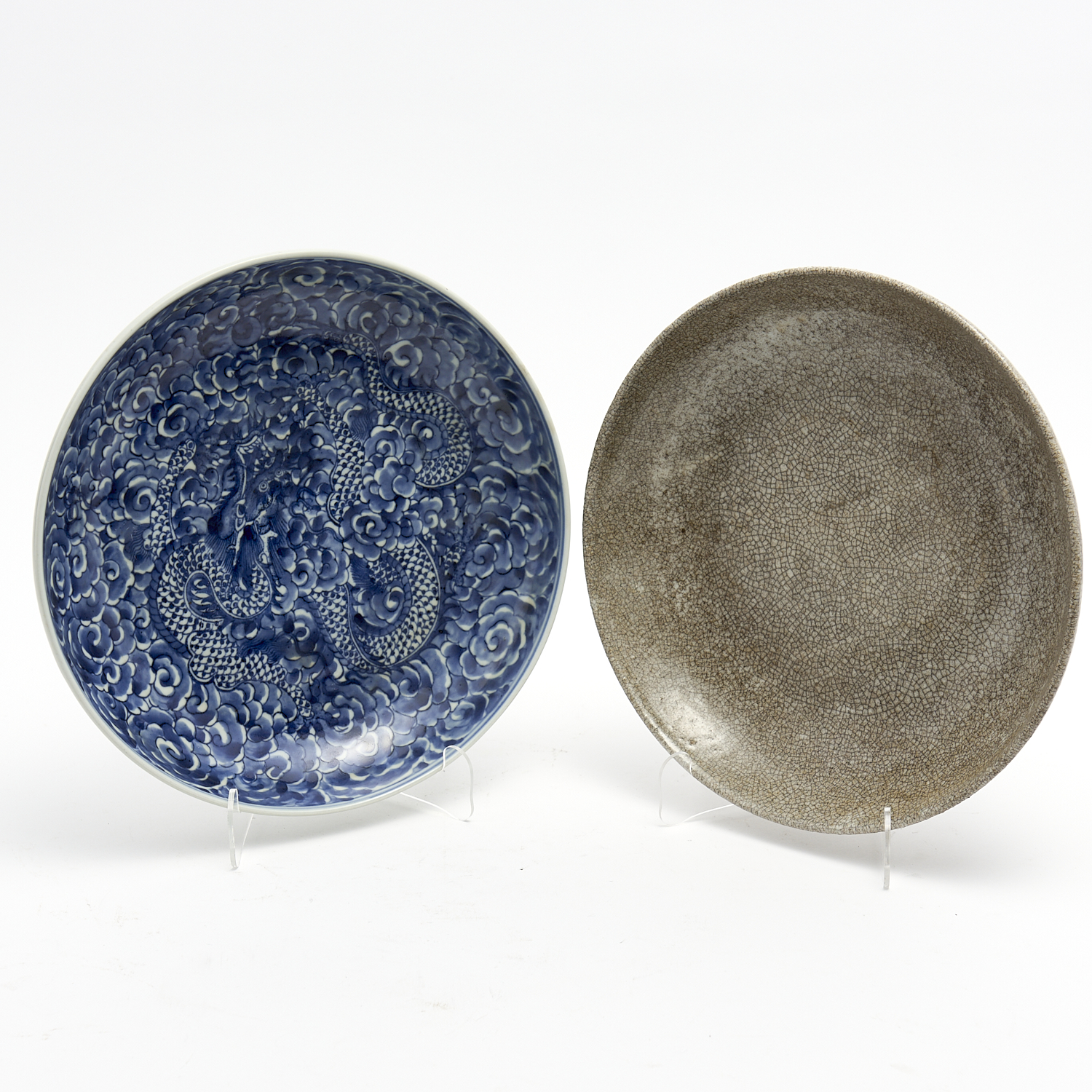 TWO CHINESE DISHES, ONE BLUE AND WHITE, THE OTHER CRACKLE GLAZE DIA.28CM (LARGEST), LEONARD JOEL DELIVERY SIZE: MEDIUM