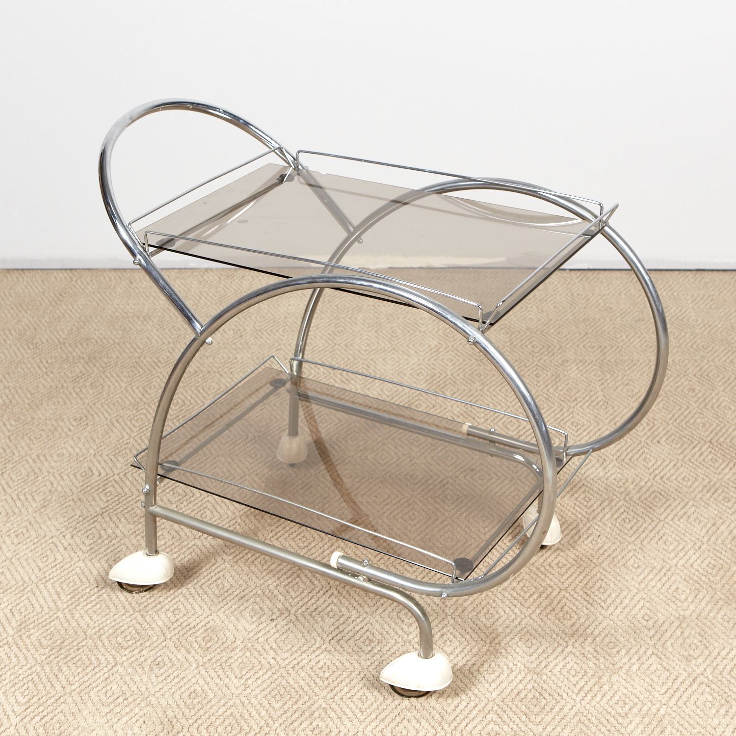 AN ART DECO CHROME & GLASS AUTO TROLLEY WITH BAKELITE CASTOR COVERS (77H X 45W X 88D CM) (LEONARD JOEL DELIVERY: X-LARGE)
