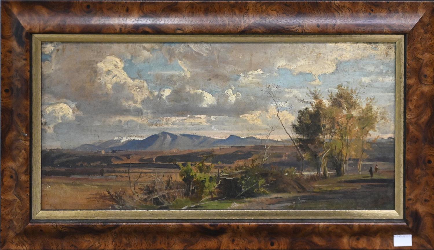 ARTIST UNKNOWN, (LANDSCAPE), OIL ON CANVAS LAID ON BOARD, UNSIGNED, 22 X 46CM, FRAME SIZE: 32.5 X 57CM