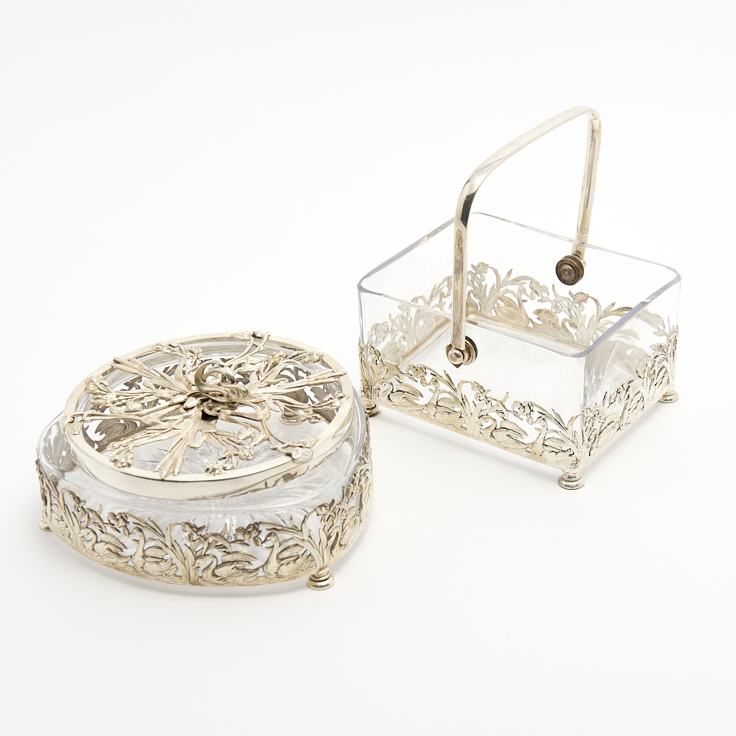 A SILVER PLATE FLORAL DECORATED LIDDED BOWL AND MATCHING BISCUIT BASKET, W.18CM, LEONARD JOEL DELIVERY SIZE: MEDIUM