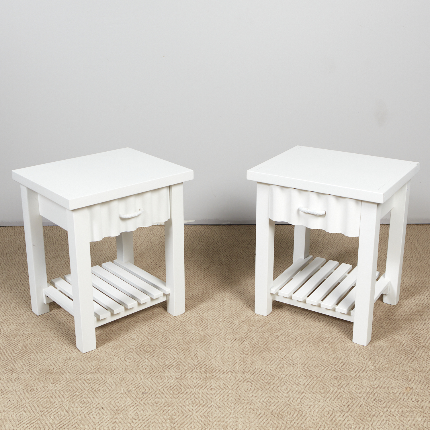 A PAIR OF WHITE PAINTED BEDSIDE TABLES (A/F) (65H X 56W X 48D CM) (LEONARD JOEL DELIVERY: X-LARGE)