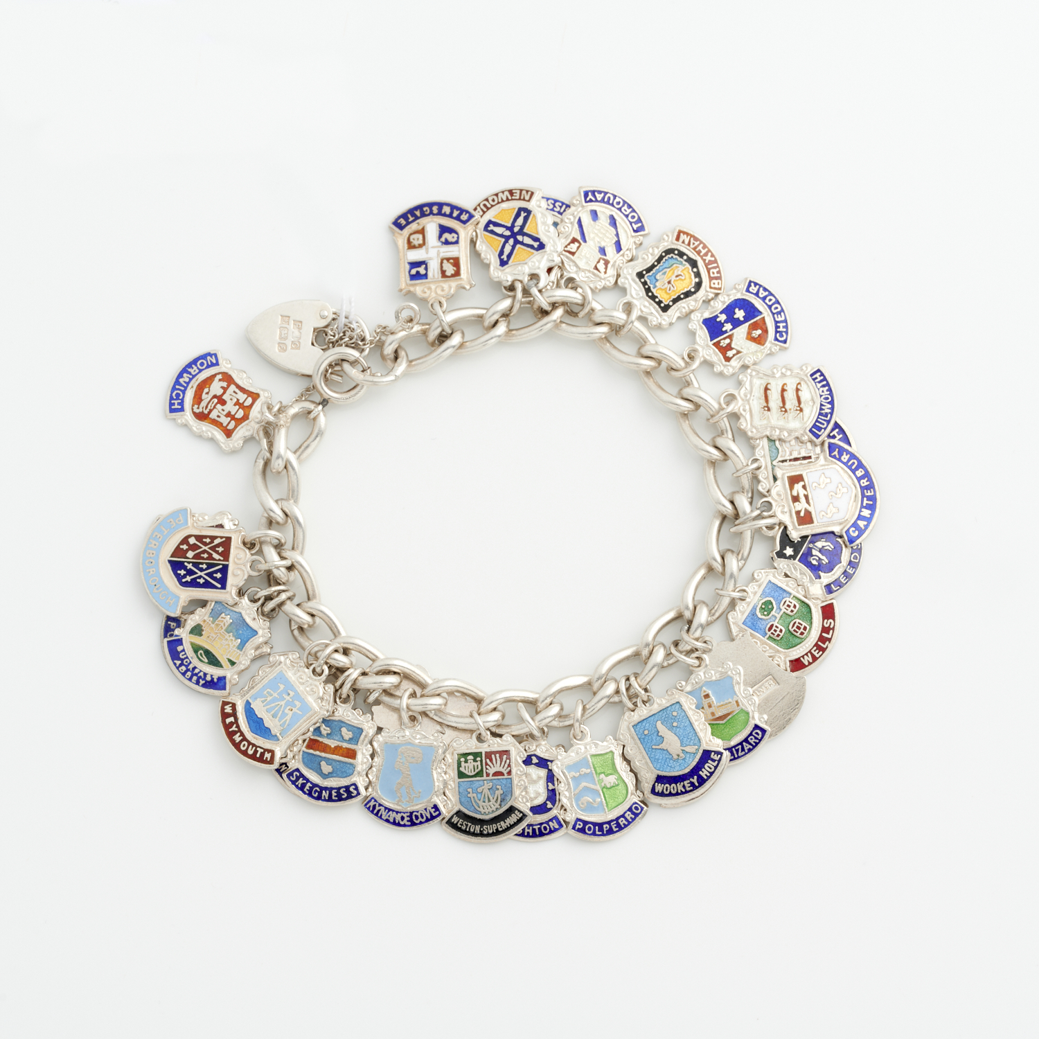 A VINTAGE ENAMEL CHARM BRACELET IN STERLING SILVER, 180MM, 60GMS