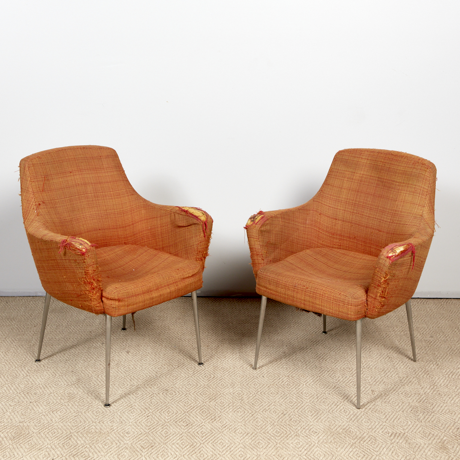 A PAIR OF MID-CENTURY FRENCH UPHOLSTERED ARMCHAIRS (A/F) (85H X 65W X 65D CM) (LEONARD JOEL DELIVERY: LARGE)